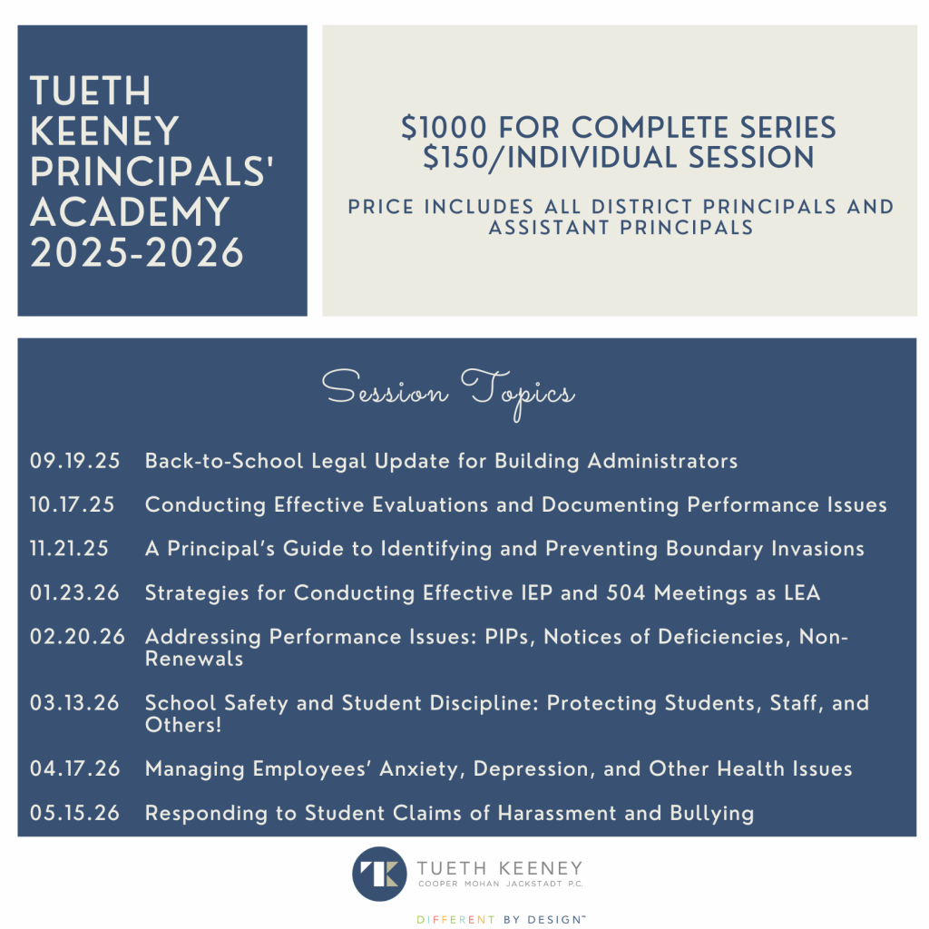 Please join Tueth Keeney attorneys for a series of in-depth webinar discussions of the legal topics that impact building administrators. As building administrators, you are frequently called upon to make quick decisions regarding student and personnel issues – and those decisions can have a significant legal impact! Gain a greater understanding of the legal principles that inform your interactions with staff and students – and come away with practical tips on how to maintain legal compliance in the performance of your duties. The focus will be on practical application of the law in the building setting.